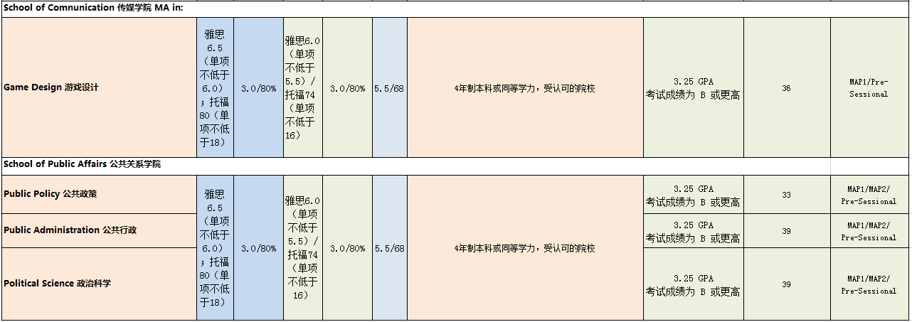 Kogod商學(xué)院是華府第一個(gè)商學(xué)院,位列全美百?gòu)?qiáng),MBA專業(yè)為全美前40。國(guó)際服務(wù)學(xué)院是全美最大的國(guó)際關(guān)系學(xué)院,眾多專業(yè)位列全美前十。傳媒學(xué)院位于全美前25,是美國(guó)第三大傳媒學(xué)院。公共事務(wù)學(xué)院位列全美前15名。