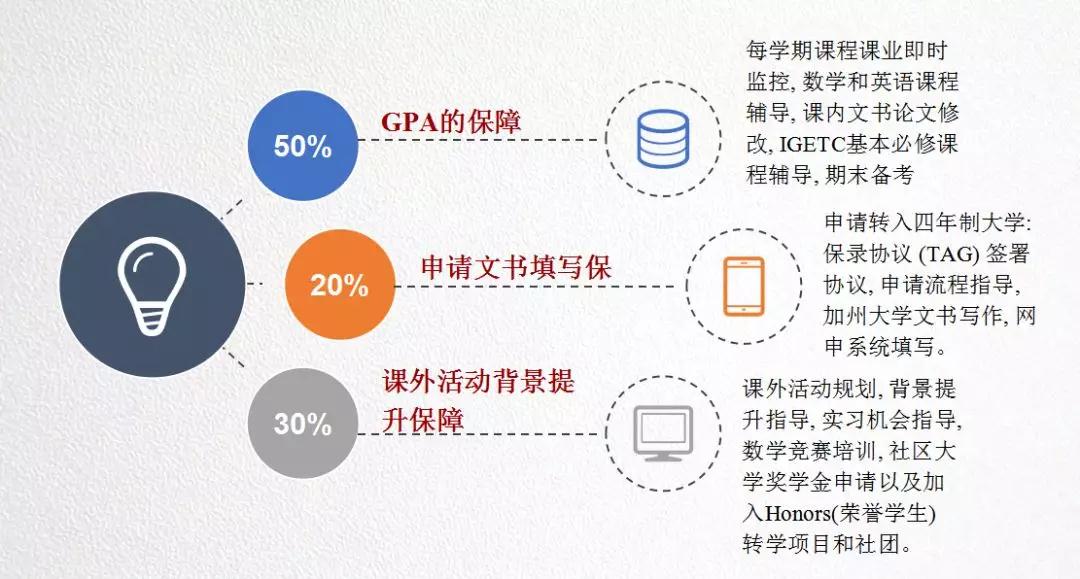 課外活動規(guī)劃, 背景提升指導(dǎo), 實習(xí)機會指導(dǎo), 數(shù)學(xué)競賽培訓(xùn), 社區(qū)大學(xué)獎學(xué)金申請以及加入Honors(榮譽學(xué)生)轉(zhuǎn)學(xué)項目和社團。