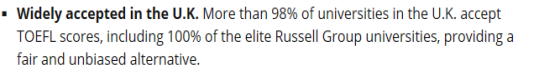 根據(jù)托福官網(wǎng)統(tǒng)計(jì),98%的英國(guó)大學(xué)正課接受托???,100%的羅素集團(tuán)大學(xué)正課接受托福。