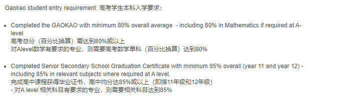 高考總分(百分比換算)需達到75%以上;對A-Level數(shù)學(xué)有要求的專業(yè),則需高考數(shù)學(xué)單科(百分比換算)達到80%;完成高中課程并獲得畢業(yè)證書,高二和高三均分在85%或以上;對A-Level相關(guān)科目有要求的專業(yè),則需要相關(guān)科目達到85%