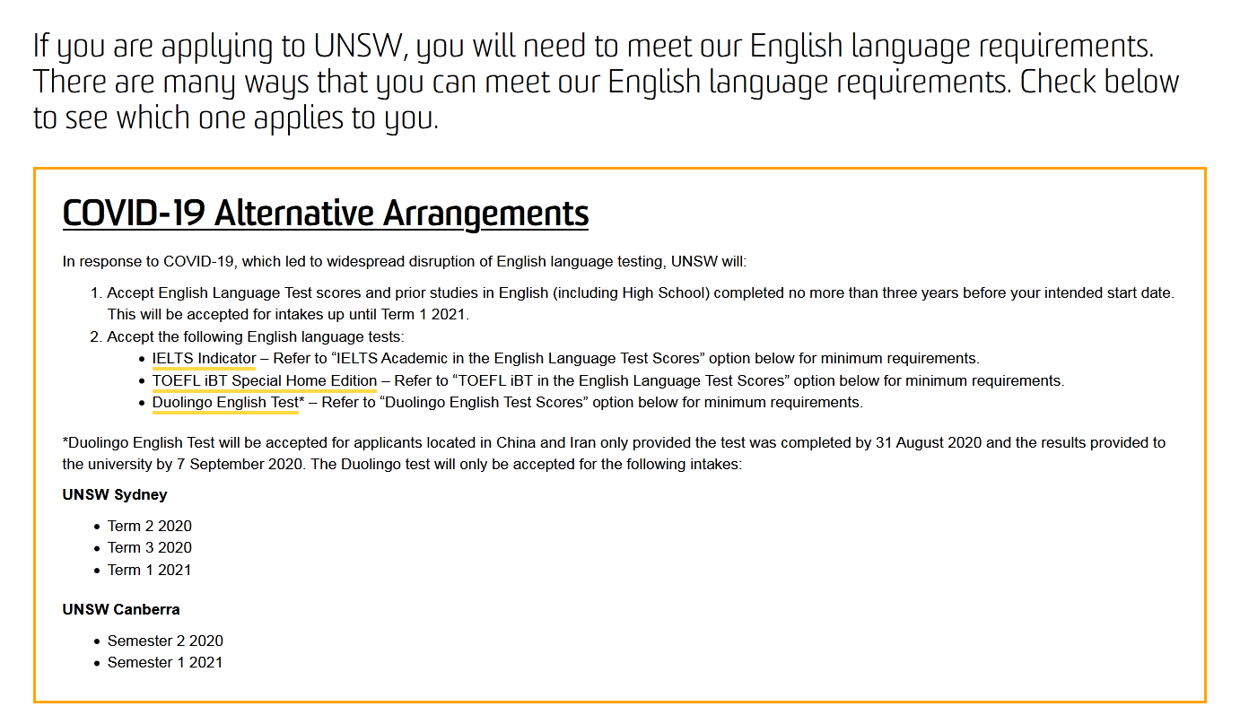 同時,大學(xué)入學(xué)辦公室已經(jīng)在近期接受Duolingo English Test,TOEFL iBT Home edition以及IELTS Indicator作為針對covid-19疫情期間的特殊語言入學(xué)應(yīng)對措施,關(guān)于此項政策的詳細(xì)內(nèi)容請移步 UNSW International ELP Page進(jìn)行了解。