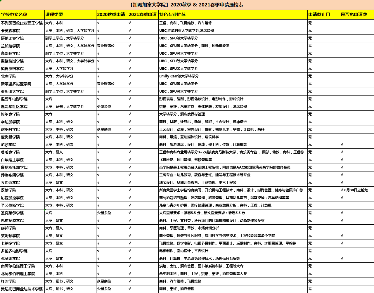 下面是加拿大學(xué)院2020秋季&2021春季選課總表,請(qǐng)各位參考: