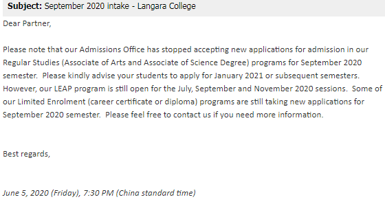 學(xué)校已經(jīng)停止接受2020年9月入學(xué)的regular studies (Associate of Arts and Associate of Science Degree) 新申請(qǐng)。請(qǐng)通知學(xué)生申請(qǐng)2021年1月入學(xué)的課程,或者更晚一點(diǎn)的課程。不過(guò),學(xué)校的LEAP 課程2020年7月,9月和11月都是開(kāi)放的。一些 Limited Enrolment (career certificate or diploma) programs 仍在接受2020年9月學(xué)期的新申請(qǐng)。
