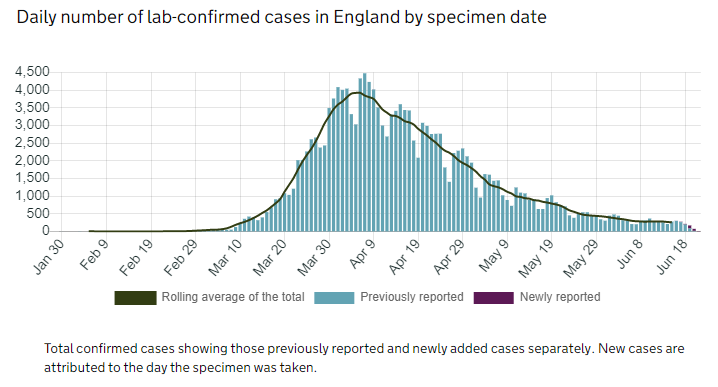 今年,對于全球來講,都是不容易的一年。疫情的消除不是短時間可以達成的,但是英國疫情如今控制的不錯。在四月份疫情高峰期過后,每天確診人數(shù)逐日遞減。一份來自GOV.UK的英格蘭每日確診人數(shù)數(shù)據(jù)圖如下: