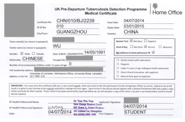 從2013年12月31日起,英國(guó)大使館簽證處要求留學(xué)生申請(qǐng)6個(gè)月以上簽證的,在遞交簽證時(shí)提供肺結(jié)核檢測(cè)報(bào)告。報(bào)告的有效期為半年。