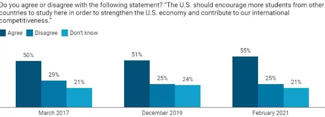 超過半數(shù)的受訪者贊同拜登政府的提案:允許那些STEM領域高級學位獲得者畢業(yè)后留在美國。考慮到特朗普在任期間宣稱國際生可能會偷走美國人的工作,調(diào)查報告得到如此結(jié)果似乎令人頗感驚喜。美國人意識到國際生對于理工科領域職位的重要性。