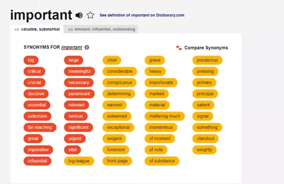 Thesaurus是一個提供正義詞和反義詞的網(wǎng)站。如果同學(xué)們在論文中不知道一些詞語的高級表達,可以使用Thesaurus網(wǎng)站。例如,在Thesaurus網(wǎng)站中輸入“Important”,會出現(xiàn)49個和“Important”相近的單詞,這樣你的論文中就不會反復(fù)出現(xiàn)“Important”。
