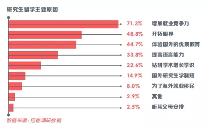 從上圖可以看出,大部分選擇同學(xué)出國深造最終目的是增加就業(yè)競爭力。隨著社會進(jìn)步和發(fā)展,各企業(yè)對員工的要求也越來越高,尤其是大公司/知名企業(yè)。雖然國家號召985或211的硬性門檻要求逐漸被淡化,但是“隱形門檻”仍然存在,若選擇國外排名較高的大學(xué)深造讀研,可以有效地彌補(bǔ)學(xué)歷背景上的不足,提高個(gè)人競爭力。