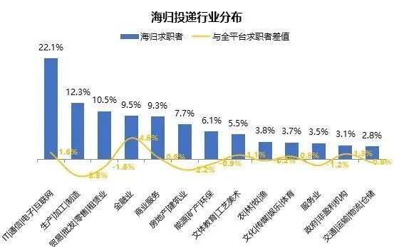 占據(jù)首位的是IT/通信/電子/互聯(lián)網(wǎng)行業(yè),集中吸引了22.1%的海歸求職者投遞簡歷占比最高,生產(chǎn)/加工/制造業(yè)(12.3%)、貿(mào)易/批發(fā)/零售/租賃業(yè)(10.5%)依次排在其后。