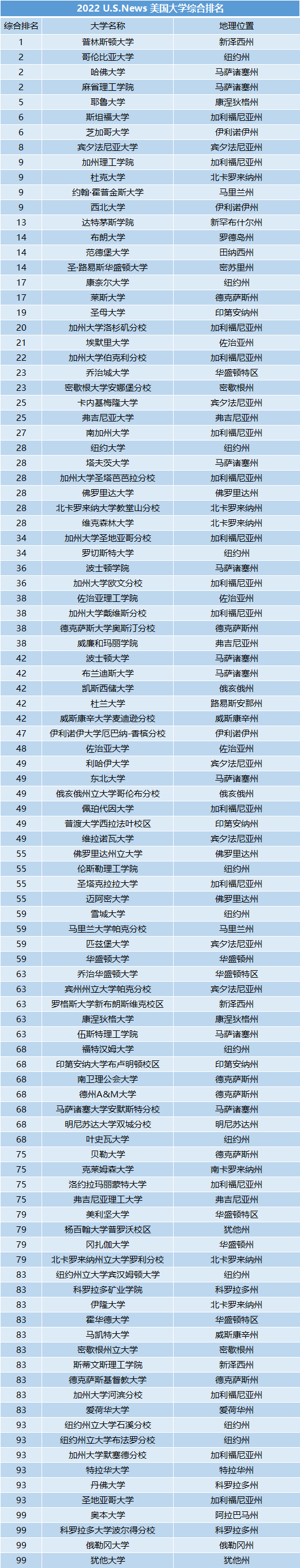 2022 U.S.News美國大學綜合排名榜單(TOP 100)