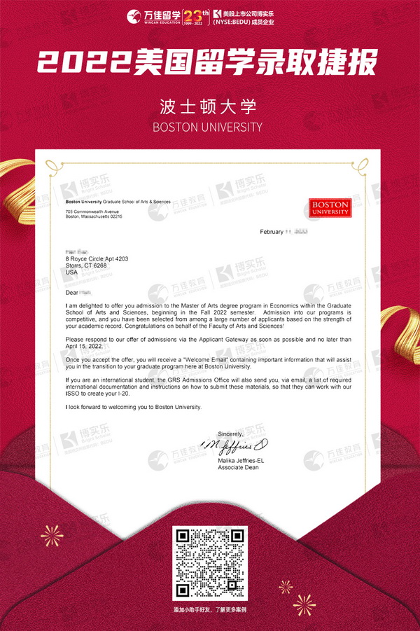 能夠獲得有分量的推薦信,再加上文書老師結(jié)合學(xué)生特點(diǎn),深層次、多角度打造個(gè)性化的專屬文書,最終學(xué)生被美國(guó)波士頓大學(xué)秒錄。