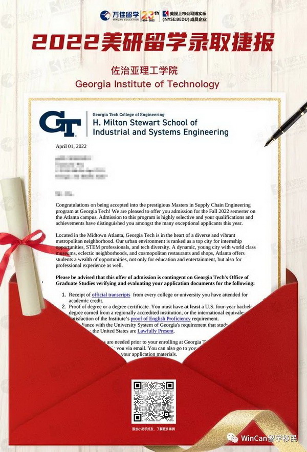 全美三大理工學(xué)院-佐治亞理工這所學(xué)校是出了名的招生量極低的學(xué)校,學(xué)校非常低調(diào)但是在美國卻有著極高的認(rèn)可度和世界排名,科研含金量非常高,學(xué)生選擇這個(gè)學(xué)校也是希望能申請到有含金量的碩士,讓自己能在專業(yè)學(xué)習(xí)的領(lǐng)域更進(jìn)一步!我們祝愿W同學(xué)以后能創(chuàng)造出更加輝煌的成績,期待能看見他讀博的身影,也祝愿他未來的發(fā)展越來越好。