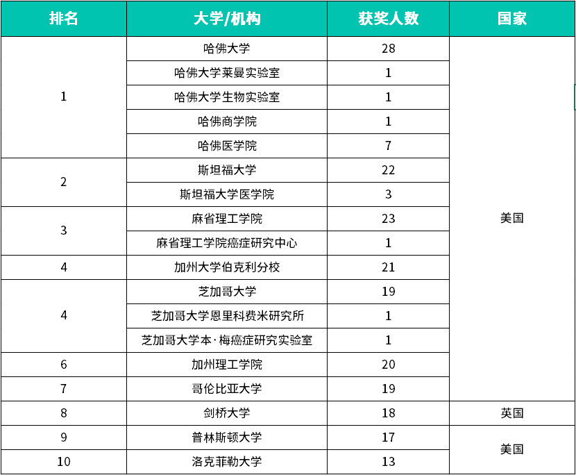 我們根據(jù)諾貝爾獎各組織的獲獎人數(shù),為大家整理出了全球大學/機構(gòu)的諾貝爾獎獲得者排行榜。諾貝爾獎獲獎情況:前十名榜單上,哈佛大學、斯坦福大學、麻省理工學院、加州大學伯克利分校以及加州理工學院這些美國院校在科學領(lǐng)域引領(lǐng)前沿。出國留學咨詢