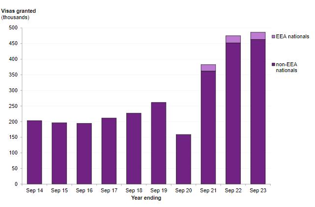 在截至2023年9月的過去一年中,英國共簽發(fā)了486,107份學生簽證,比上一年度增長了2%,但相比新冠爆發(fā)前(截至2019年9月的一年)則增長了86%!英國留學