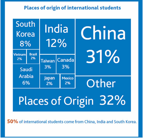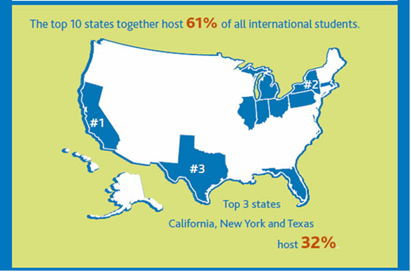 加州,紐約州和德州是最熱門的地區(qū), 32%國際學生就讀